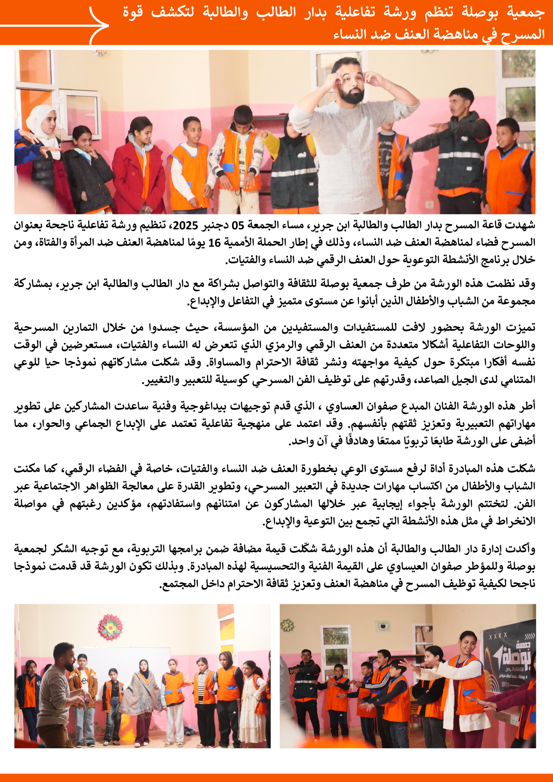 جمعية بوصلة تنظم ورشة تفاعلية بدار الطالب والطالبة لتكشف قوة المسرح في مناهضة العنف ضد النساء