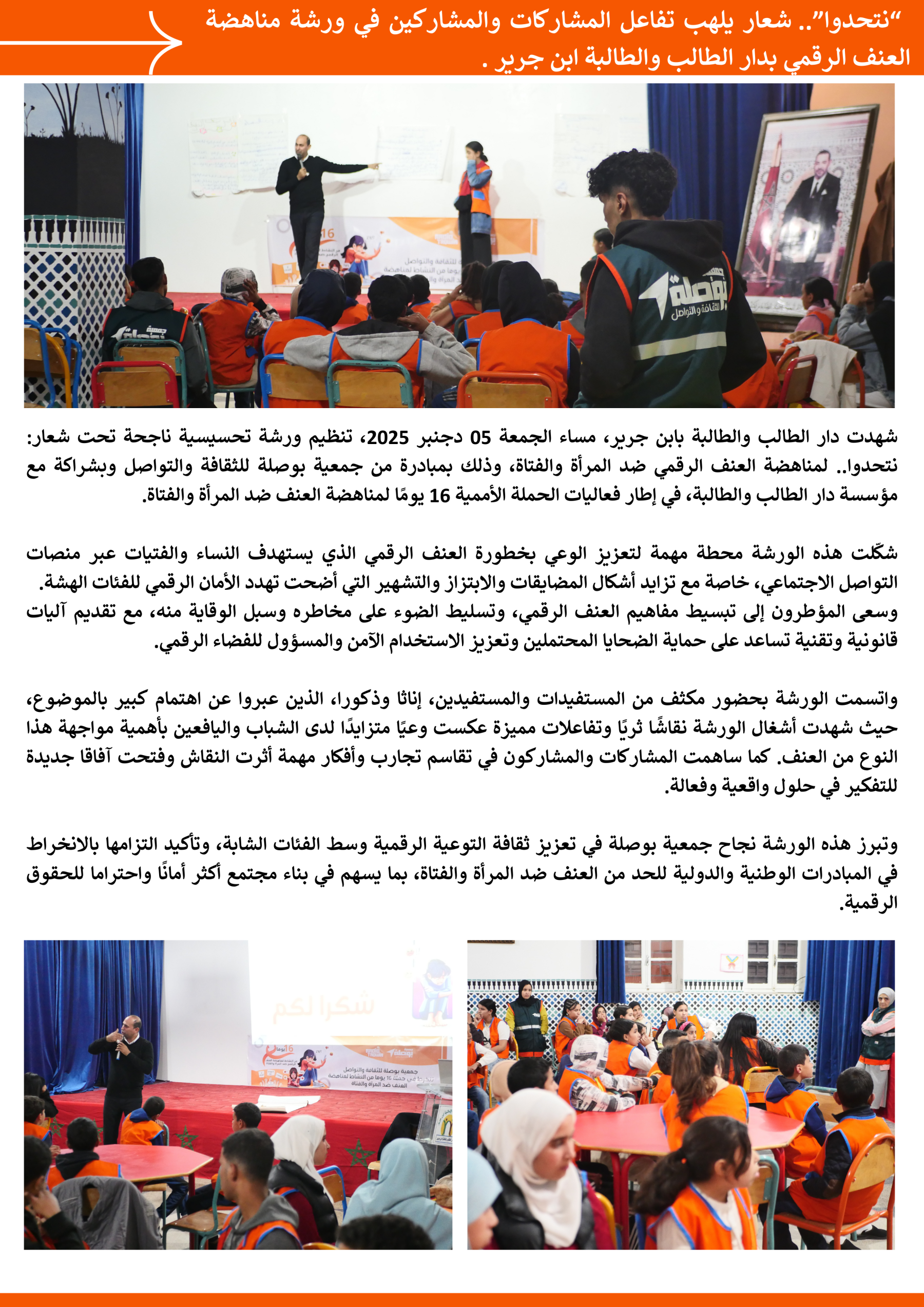 “نتحدوا”.. شعار يلهب تفاعل المشاركات والمشاركين في ورشة مناهضة العنف الرقمي بدار الطالب والطالبة ابن جرير .