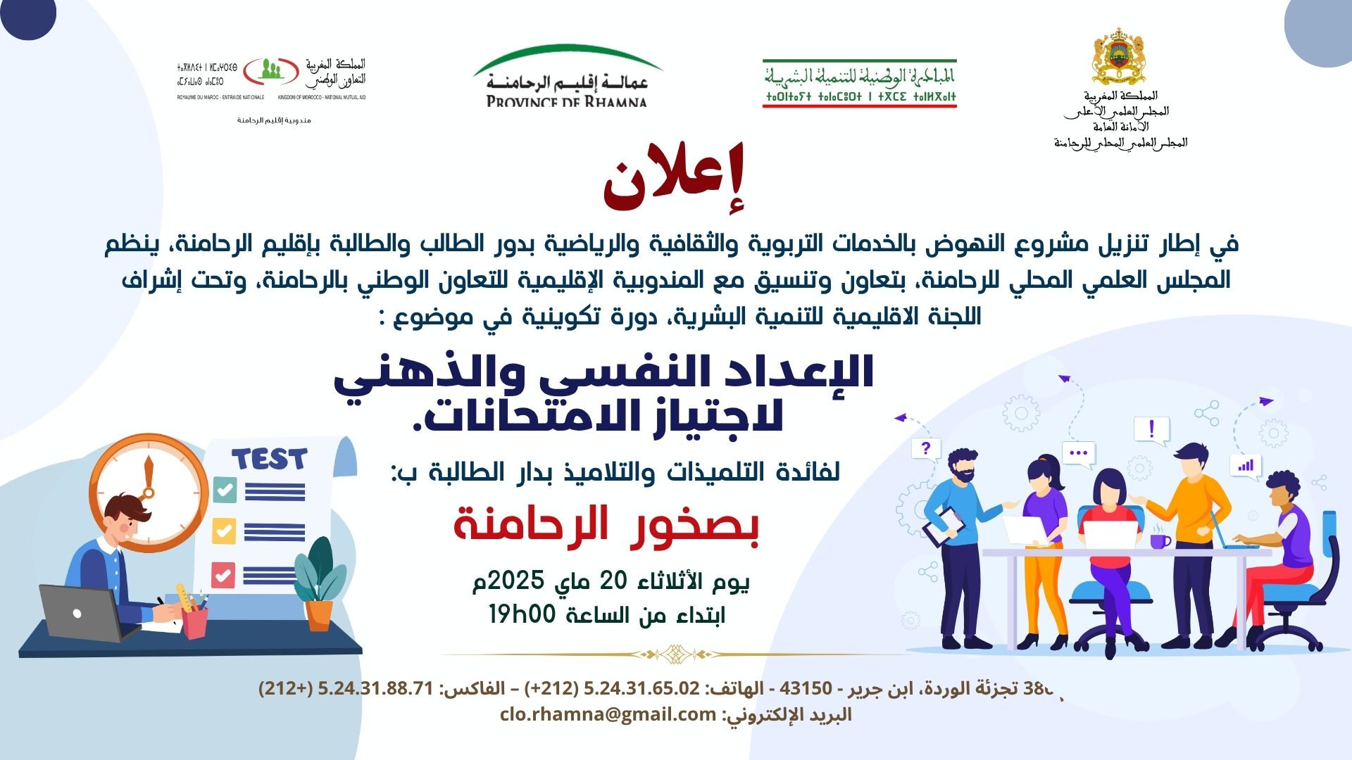 في إطار تنزيل مشروع النهوض بالخدمات التربوية والثقافية والرياضية بدور الطالب والطالبة بإقليم الرحامنة، ينظم المجلس العلمي المحلي للرحامنة، بتعاون وتنسيق مع المندوبية الإقليمية للتعاون الوطني بالرحامنة، وتحت إشراف اللجنة الاقليمية للتنمية البشرية، دورة تكوينية في موضوع : “الإعداد النفسي و الذهني لاجتياز الامتحانات” لفائدة التلميذات و التلاميذ بدار الطالب و الطالبة بصخور الرحامنة يوم الثلاثاء 20 ماي 2025