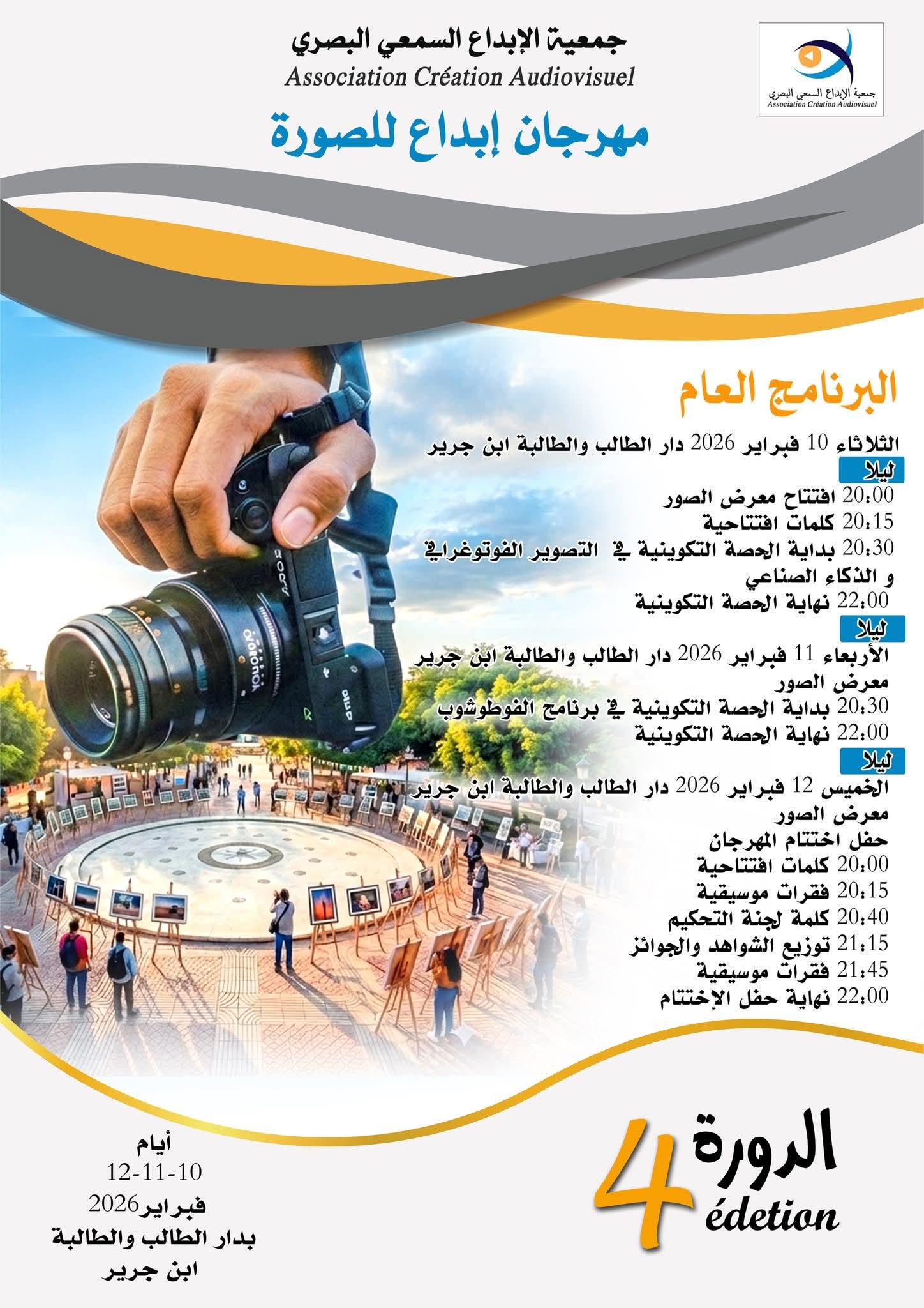 بأجواء مفعمة بالفن والإبداع، شهدت دار الطالب والطالبة بن جرير يوم 10 فبراير 2026، افتتاح النسخة الرابعة من مهرجان إبداع الصورة، المنظم من طرف “جمعية الإبداع السمعي البصري” بشراكة مع المجلس الحضري لمدينة ابن جرير وإدارة دار الطالب والطالبة بن جرير. وقد توج حفل الافتتاح بزيارة معرض الصور الخاص بالمشاركين والمشاركات حيث تزينت الأروقة بصور فوتوغرافية جسدت شعار الدورة: "الصورة نافذة للتأمل والإبداع". هذه الأعمال الفنية لم تكن مجرد لقطات عابرة، بل كانت انعكاس لمواهب شابة مبدعة استطاعت تحويل لحظات الزمن إلى لوحات فنية تسر الناظرين. لم تتوقف رحلة المعرفة عند حدود "تقنيات التصوير الفوتوغرافي". فمباشرة بعد حصة القواعد البصرية ، انتقل المشاركون والمشاركات إلى عالم التكنولوجيا الحديثة من خلال ورشة تكوينية في "الذكاء الاصطناعي". في إطار الأنشطة التكوينية، نظمت جمعية الإبداع السمعي البصري يومه 11 فبراير 2026 بدار الطالب والطالبة بن جرير، ورشة تطبيقية خاصة ببرنامج "أدوب فوتوشوب" (Adobe Photoshop). استهدفت الورشة المشاركين والمشاركات بدار الطالب والطالبة بن جرير، بهدف تمكينهم من أدوات تعديل الصور والارتقاء بلمساتهم الفنية. تفاعل كبير ورغبة واضحة في التعلم أبان عنها المشاركون والمشاركات. وقد أسدل الستار يوم الخميس 12 فبراير 2026 على فعاليات مهرجان إبداع للصورة في نسخته الرابعة. حيث توجت هذه الدورة بتنظيم أمسية فنية بهيجة شهدت تكريم المواهب الواعدة وتوزيع الشواهد التقديرية و الجوائز على الفائزين والفائزات في مسابقة التصوير الفوتوغرافي. و كانت النسخة الرابعة محطة استثنائية للاحتفاء بالعين المبدعة، وبصمة فنية تؤكد أن "الصورة نافذة للتأمل والإبداع". .jpg)
