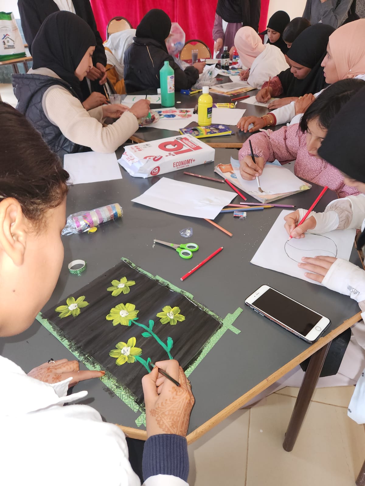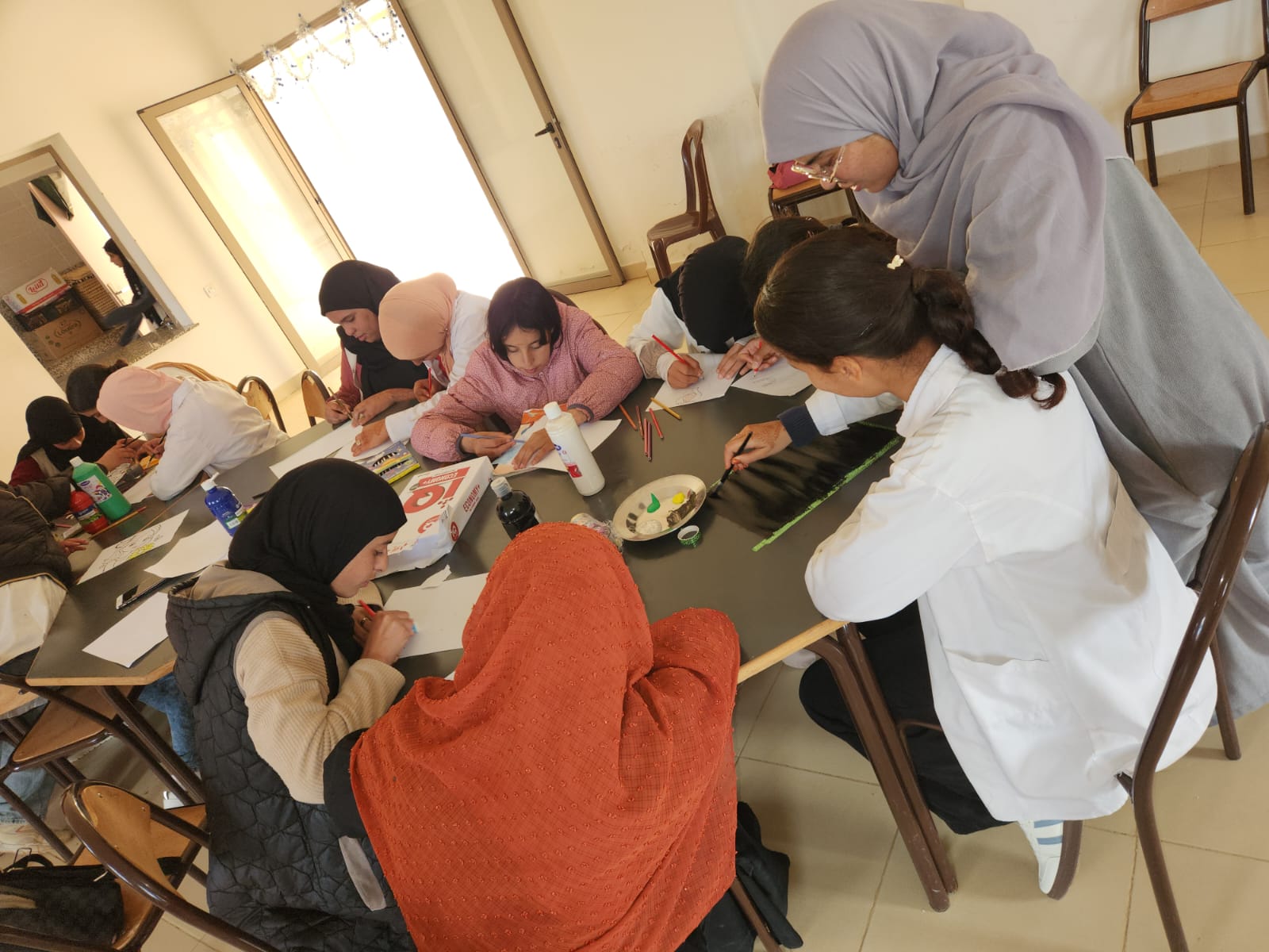 "في إطار مشروع دعم التفتح لدى الشباب بدار الطالبة سيدي بوبكر، وتحت إشراف اللجنة الإقليمية للتنمية البشرية بإقليم الرحامنة، وبشراكة مع جمعية بوصلة للأعمال الاجتماعية وذلك وفق ما جاء في اتفاقية الشراكة مع جمعية تدبير دار الطالبة سيدي بوبكر والتي خصا جزءا منها لتفعيل النوادي بمؤسسات الرعاية الاجتماعية وتركيز الضوء على مهارات ومواهب المستفيدات بعد حصولها على الادوات والاساسيات التي تحتاجها لتفعيل النوادي المقدمة من جمعية بوصلة للاعمال الاجتماعية قامت دار الطالبة سيدي بوبكر ببرمجة ورشة للتلوين والرسم من خلال النادي الفني بالمؤسسة من تاطير سناء الوزان تحفيزا للمستفيدات على الرسم والتلوين وتحريك فضولهم من خلال تجربة ادوات التلوين والصباغة المقدمة من جمعية بوصلة ضمن بادرة طيبة تستحق عليها فائق الشكر زوالامثنان قامت المؤسسة ببرمجة هده الحصصة اعطاء الادوات للمستفيدات وتعليمهم كيفية دمج الالوان الاساسية للحصول على الوان ثانوية اعطاء المستفيدات رسومات للاستئناس من اجل تلوينها لتعليمهم طرق التلوين ومحاولة اعطاء نفس الرسم اكتر من مستفيدة لترسيخ فكرة ان منضور الامور يختلف من شخص لاخر رغم تشابه الامر نفسه تجربة الالوان والفراشي لمعرفة طريقة عمل كل واحدة ومعرفة طريقة التعامل مع الالوان وقد لقيت الحصص ترحيبا واستحسانا من طرف المستفيدات و وقد بدت عليهم معالم الفرح والاستمتاع وعبرو عن شكرهم لجمعية بوصلة