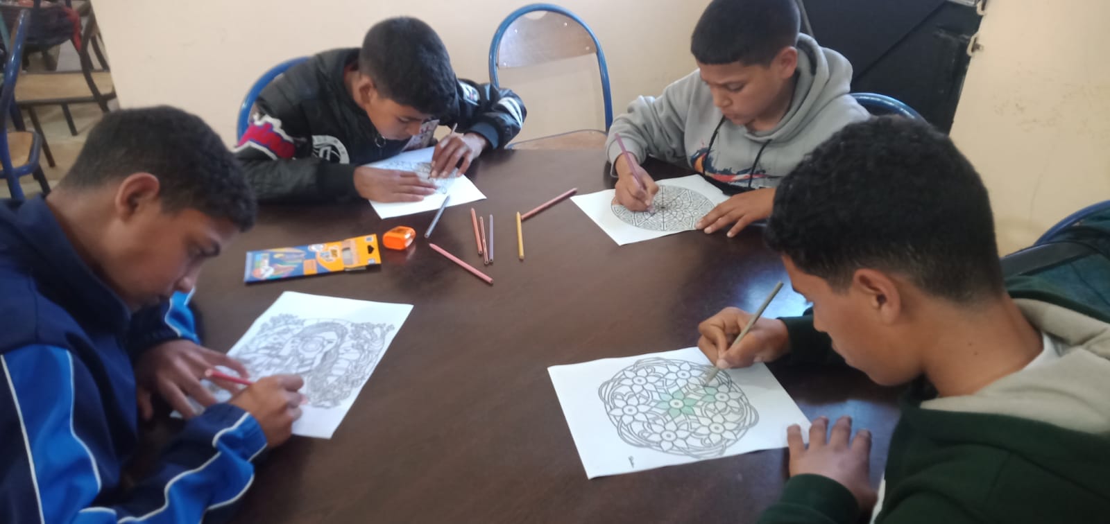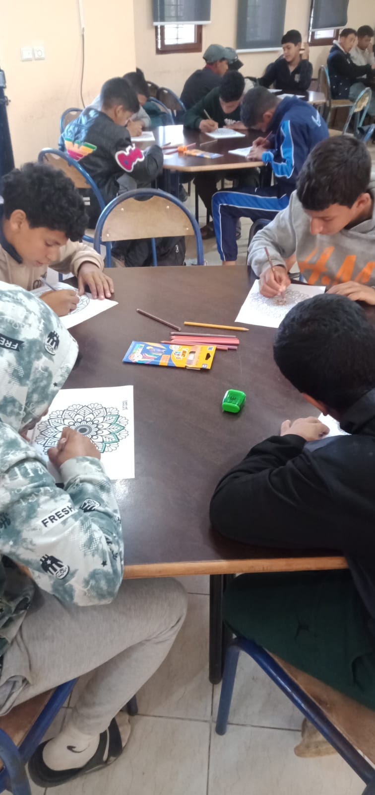 وتهدف هذه الورشة إلى تنمية الحس الفني والابداعي لدى المستفيدين وتعزيز قدراتهم على التعبير عن أفكارهم ومشاعرهممن خلال التلوين ،إضافة إلى خلق جو من الترفيه والتفاعل الايجابي بينهم؟،وقد عرفت هذه الورشة مشاركة عدد مهم من المستفيدين ، حيث تم توفير أدوات التلوين الضرورية خاصة التي ثم استيلامها في إطار مشروع دعم التفتح لدى شباب هذه الممؤسسة ، والذي تشرف عليه جمعية بوصلة بشراكة مع المبادرة الوطنية والجمعية الخيرية لدار الطالب ، وقد أطر هذه الورشة أعضاء النادي الثقافي والمشرف على النادي، وقد تميزت اجواء الورشة بالحماس والانضباط والانخراط الكبير من طرف المستفيدين .