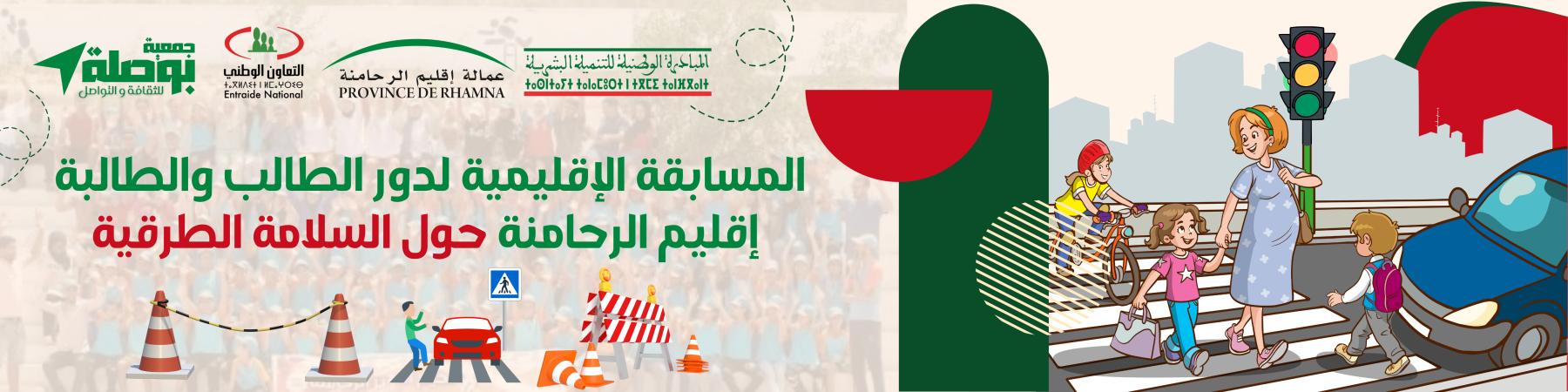 في إطار تنزيل مشروع النهوض بالخدمات التربوية والثقافية والرياضية بدور الطالبة والطالب بإقليم الرحامنة، تنظم جمعية بوصلة للأعمال الاجتماعية، بشراكة مع اللجنة الإقليمية للتنمية البشرية بإقليم الرحامنة، بمناسبة اليوم الوطني للسلامة الطرقية بالمغرب، الذي يخلد في 18 فبراير من كل سنة، المسابقة الإقليمية لدور الطالب والطالبة بإقليم الرحامنة حول السلامة الطرقية. أهداف المسابقة - نشر ثقافة السلامة الطرقية لدى شباب وأطفال دور الطالب والطالبة بإقليم الرحامنة. تقتصر المشاركة على مستفيدي ومستفيدات دور الطالب والطالبة بإقليم الرحامنة. 1- الملصق التحسيسي: تصميم يُبرز رسائل حول أهمية السلامة الطرقية. - ارتباط العمل بموضوع السلامة الطرقية. - تُرسل الأعمال المشاركة عبر تعبئة استمارة التسجيل والمشاركة في المسابقة عبر الرابط الإلكتروني الخاص https://forms.gle/EhhdUstcBGN4Ak9J9 هام : ستُعرض الأعمال المشاركة طيلة الموسم بمؤسسات دار الطالب والطالبة بإقليم الرحامنة خلال جولة قافلة القرب للتنشيط السوسيوثقافي – الرياضي. - تُخصص جوائز قيمة للفائزين الثلاثة الأوائل في كل صنف (الملصق التحسيسي واللوحة الفنية التحسيسية). تتكون اللجنة المنظمة من ممثلين جمعية بوصلة الأعمال الاجتماعية، وخبراء في مجال السلامة الطرقية، وفنانين متخصصين في التصميم والفنون التشكيلية. أحكام عامة لمزيد من المعلومات، يرجى التواصل مع اللجنة المنظمة على رقم الواتساب التالي: 0662214759 .png)